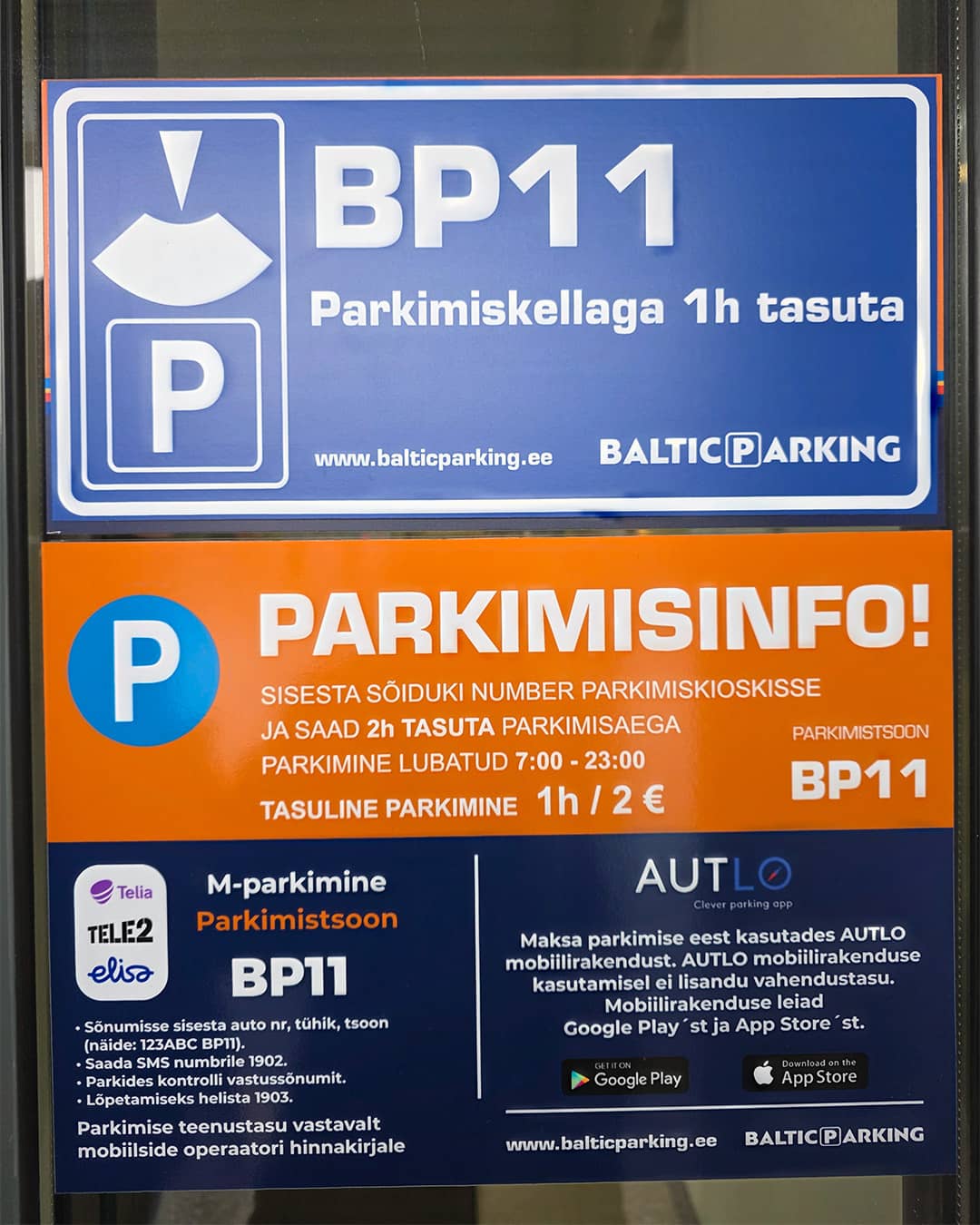 auto_nr BP11(näiteks: 123ABC BP11) - Oodake kinnitussõnumit - parkimine kehtib alles pärast kinnitust ja maksab 2 €/tund.